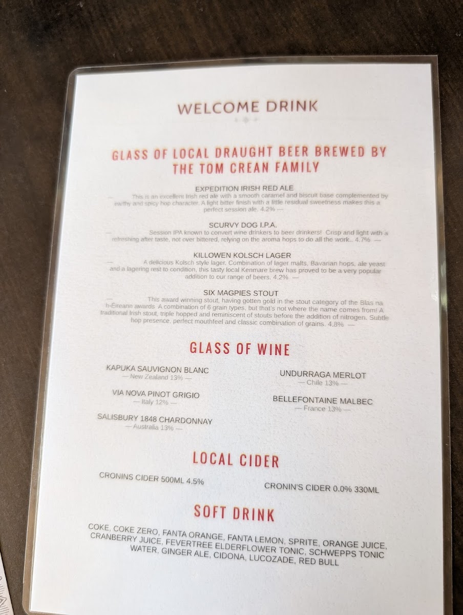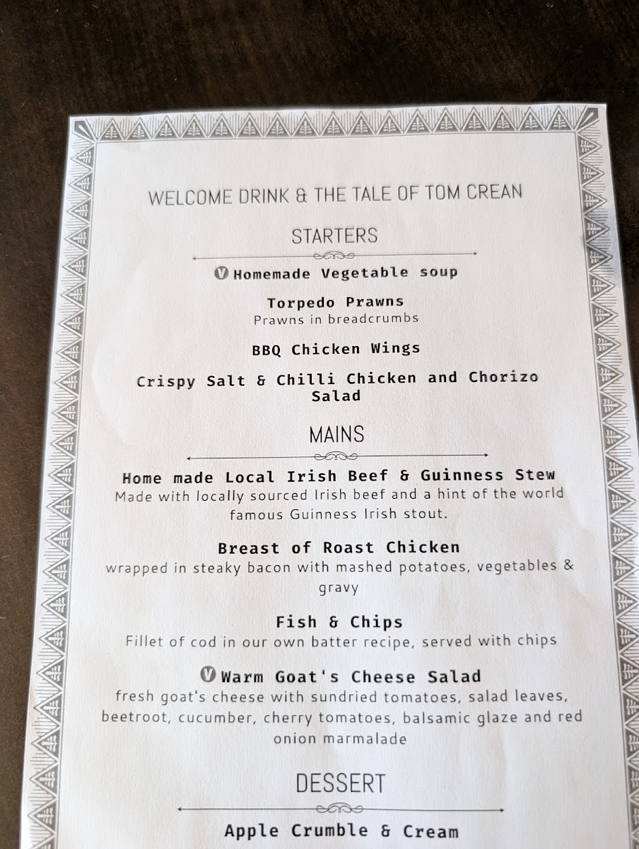 The drink selection complements the food with an emphasis on classic Irish flavors, including a perfectly poured Pint of Guinness, a smooth Whiskey or the iconic Irish Coffee—an ideal choice to relax into the friendly pub setting. For craft beer enthusiasts, the local Tom Crean IPA offers a contemporary twist rooted in the area’s history.